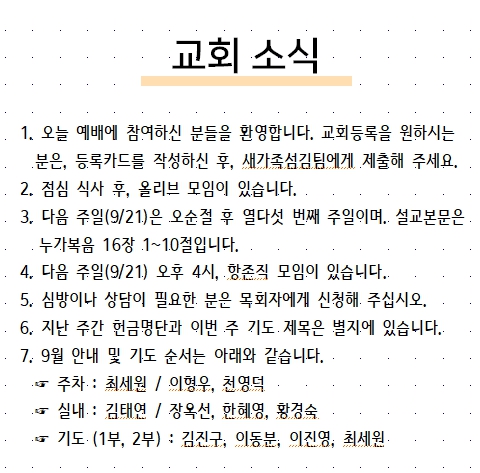 2025년 9월 14일 교회소식